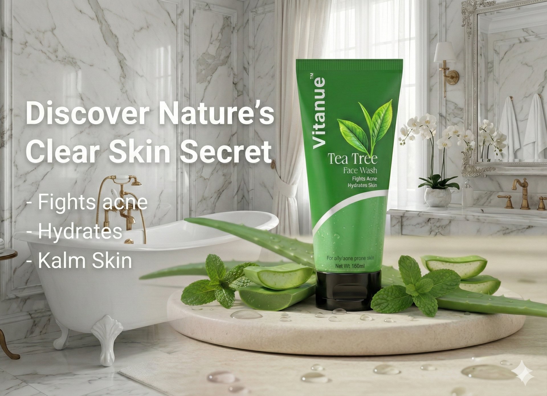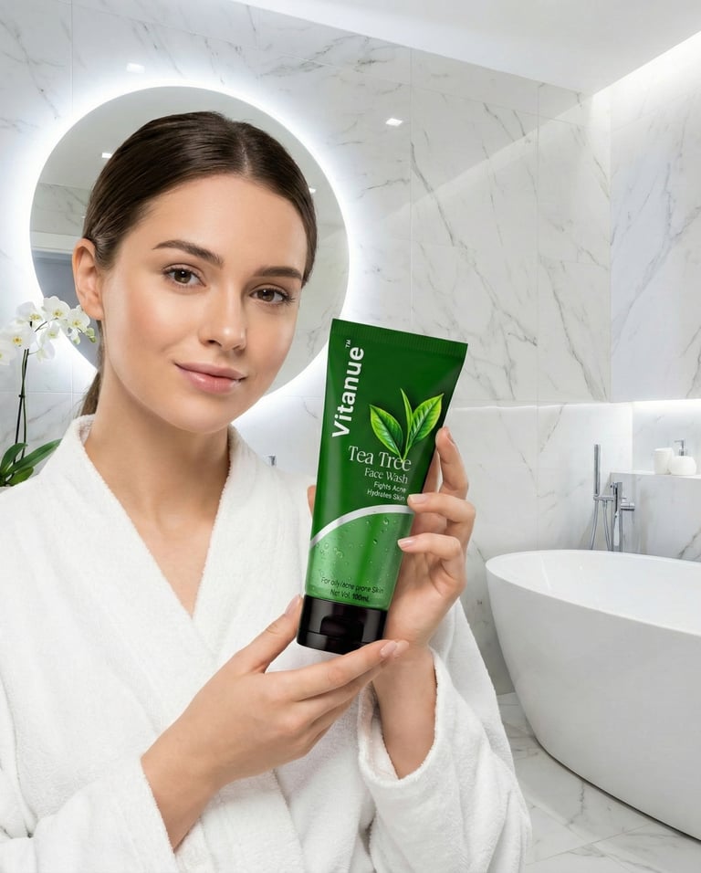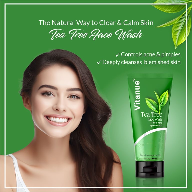Clear skin starts with a fresh cleanse. Our Tea Tree Face Wash fights acne, controls oil, and keeps your skin clean, bright, and balanced every day.