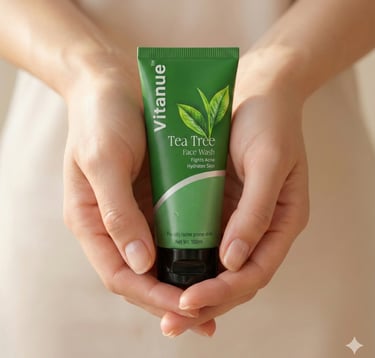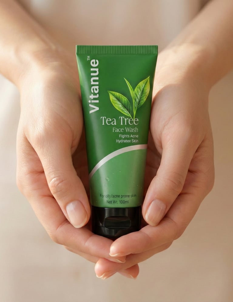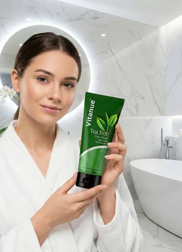 The Vitanue Tea Tree Face Wash is crafted for anyone struggling with acne, oiliness, or dull skin. This refreshing daily cleanser combines the power of Tea Tree Oil, Rose Extract, and Vitamin E to deeply cleanse your pores while keeping your skin calm and hydrated.